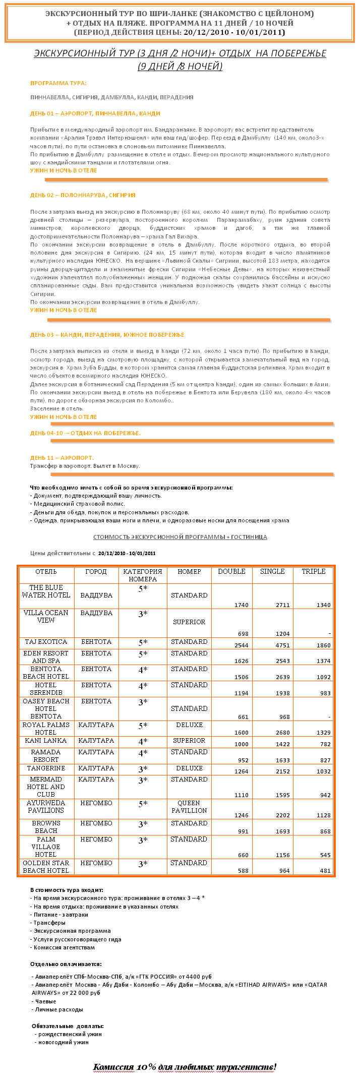 24 Ноя 2010 11:31:24 ШРИ-ЛАНКА. ЭКСКУРСИОННЫЙ ТУР (3 ДНЯ /2 НОЧИ)+ ОТДЫХ НА ПОБЕРЕЖЬЕ (9 ДНЕЙ /8 НОЧЕЙ) - от фирмы ГОРИЗОНТ БЕЗ ГРАНИЦ