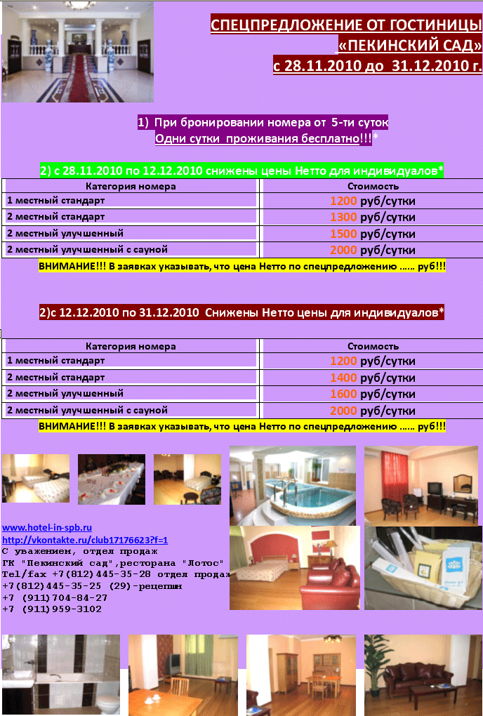 РОССИЯ - СПб - отель Пекинский Сад, АКЦИЯ 5+1 и СПО на НОЯБРЬ-ДЕКАБРЬ от фирмы HOTEL IN SPB |