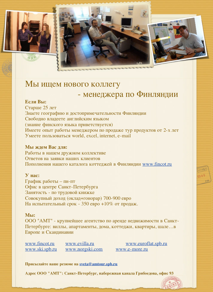 25 Ноя 2010 11:04:46 ВАКАНСИЯ МЕНЕДЖЕР ПО ФИНЛЯНДИИ от фирмы АМТ