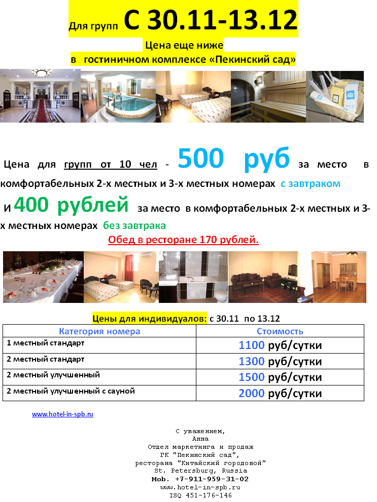 РОССИЯ-СПБ - РАЗМЕЩЕНИЕ - 30.11-13.12 400 рублей без завтрака 500 руб. с завтраком 2-х местное размещение от фирмы HOTEL IN SPB |
