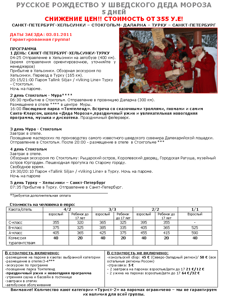 01 Дек 2010 18:10:49 ШВЕЦИЯ: спецпредложение! Рождество у Шведского деда мороза от 355 у.е.!! Снижение цен! от фирмы РУССКИЙ ЭКСПРЕСС