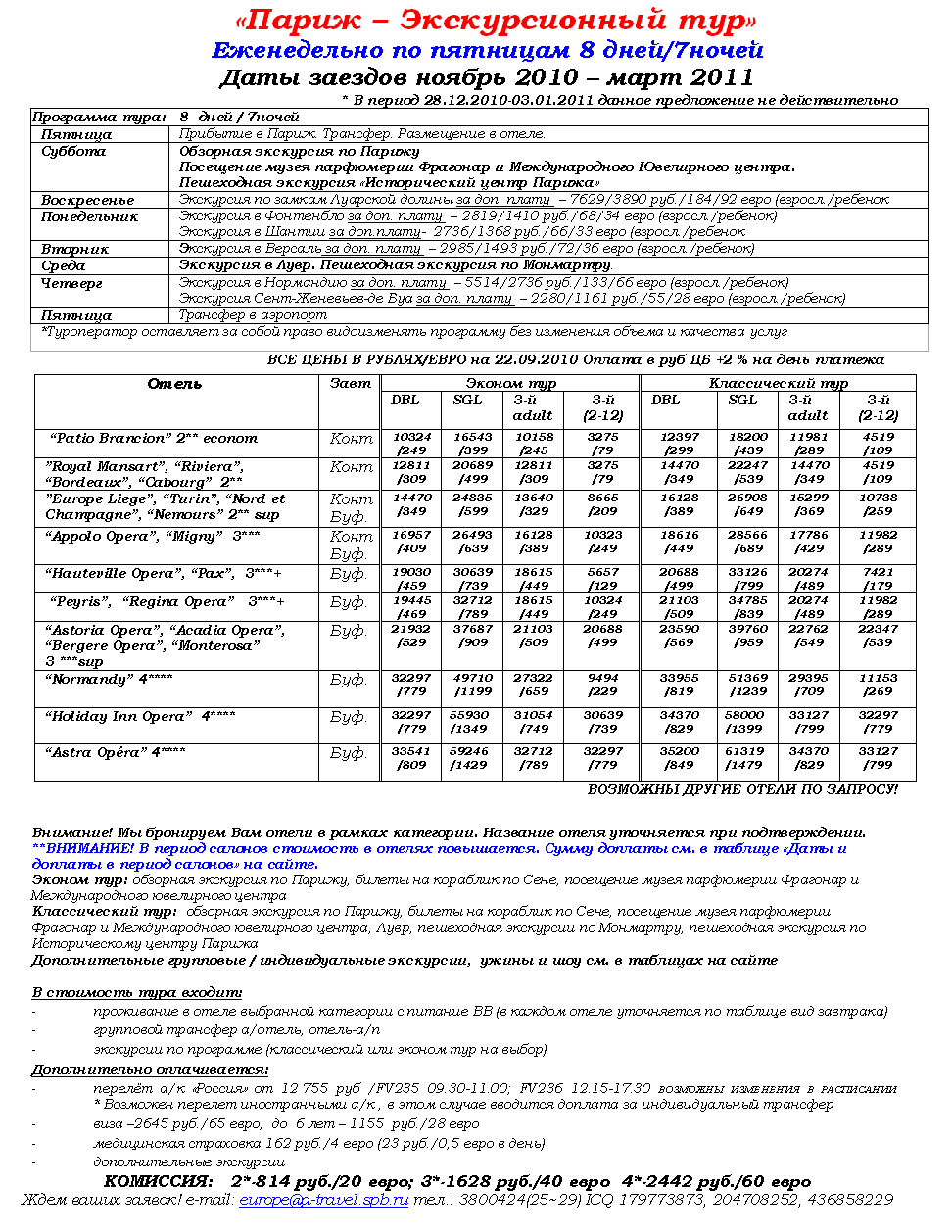 02 Дек 2010 15:43:29 ФРАНЦИЯ-<ПАРИЖ - Экскурсионный тур> ноябрь 2010-март 2011 от фирмы АКАДЕМИЯ