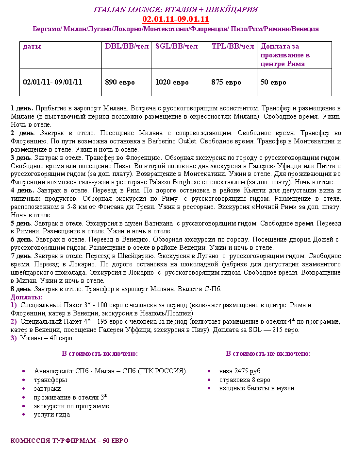 03 Дек 2010 15:01:15 ИТАЛИЯ+ШВЕЙЦАРИЯ 02.01-09.01 - ITALIAN LOUNGE от фирмы МЕРКУРИЙ