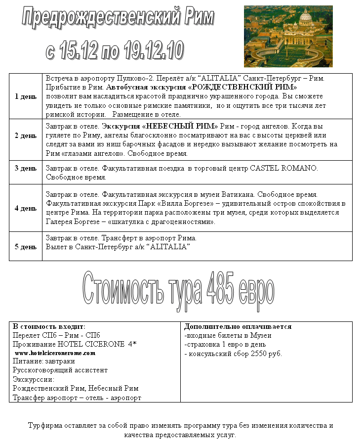 ИТАЛИЯ-ПРЕДРОЖДЕСТВЕНСКИЙ Рим с 15.12 по 19.12.10 от фирмы EUROPE-TOUR |