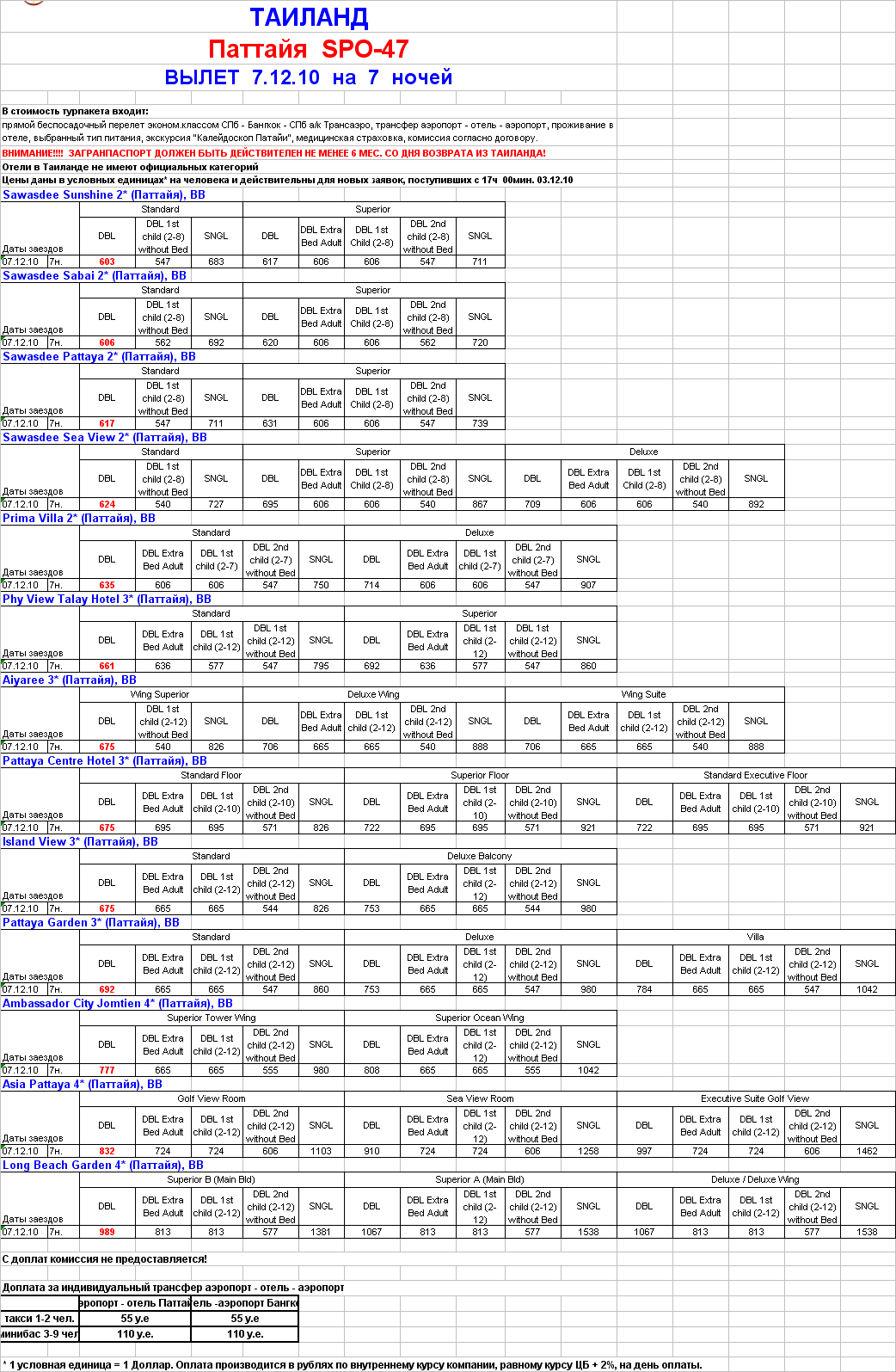 04 Дек 2010 12:31:46 ТАИЛАНД, ПАТТАЙЯ с 7.12.10 от 603 уе, СУПЕР-СПЕЦПРЕДЛОЖЕНИЕ - от фирмы ЮЖНЫЙ КРЕСТ
