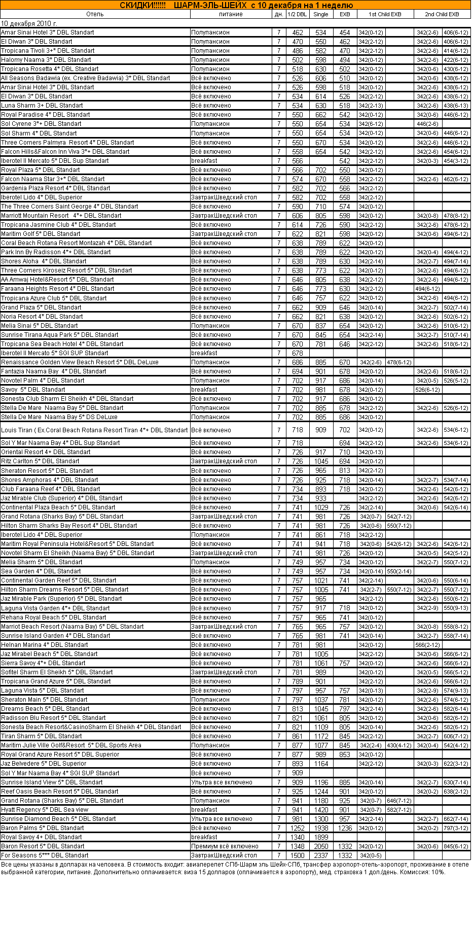 06 Дек 2010 11:17:53 ЕГИПЕТ-СКИДКИ! СПб-Шарм-СПб, с 10 декабря на 1 неделю от фирмы АЛМА ТУР