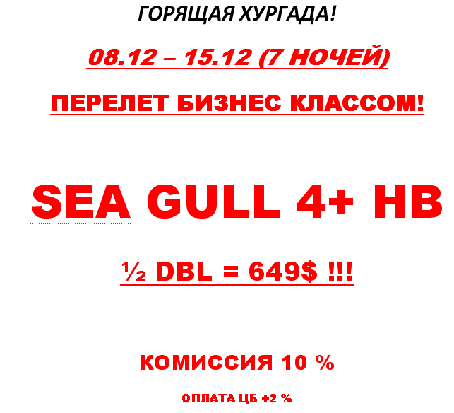 07 Дек 2010 14:11:50 ЕГИПЕТ - ХУРГАДА с 08.12-15..12 на 7н - SEA GULL 4* 1/2 DBL за 649$, перелет бизнес-классом, ком. 10% от фирмы TRIVE ТУР