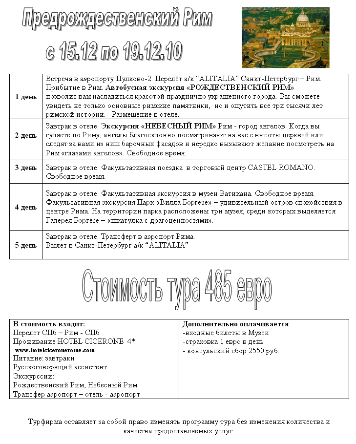 ИТАЛИЯ-ПРЕДРОЖДЕСТВЕНСКИЙ Рим с 15.12 по 19.12.10 от фирмы EUROPE-TOUR |