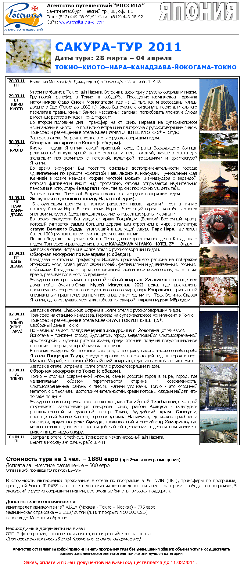 13 Дек 2010 11:15:16 ЯПОНИЯ. САКУРА-ТУР 2011. 28 марта - 04 апреля от фирмы РОССИТА