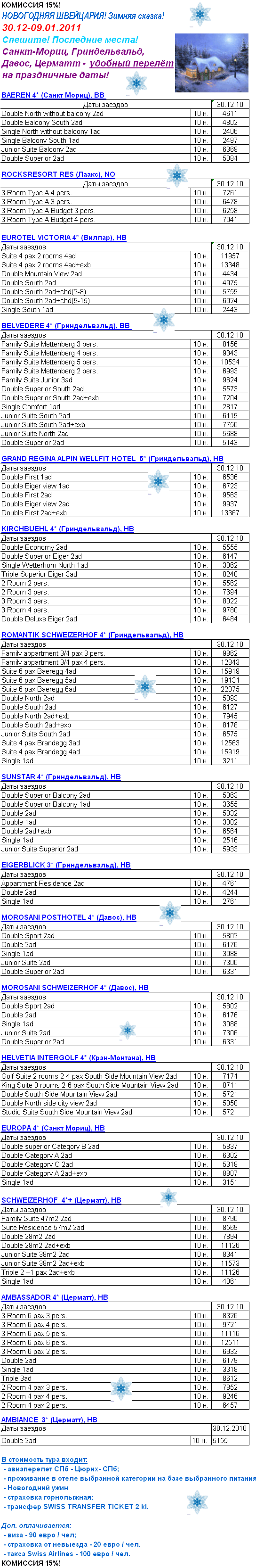 15 Дек 2010 11:48:48 ШВЕЙЦАРИЯ Новогодняя 30.12-09.01 - Комиссия 15% от фирмы ДЖЕТ ТРЕВЕЛ САНКТ-ПЕТЕРБУРГ