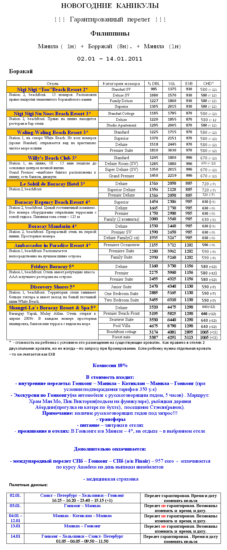 20 Дек 2010 16:19:30 ФИЛИППИНЫ (о. Боракай) НА НОВОГОДНИЕ КАНИКУЛЫ ПО СУПЕР ЦЕНЕ~ 02/01 - 14/01 ~ ГАРАНТИРОВАННЫЕ ПЕРЕЛЕТ а/к FINNAIR ~ от фирмы INTURION.RU