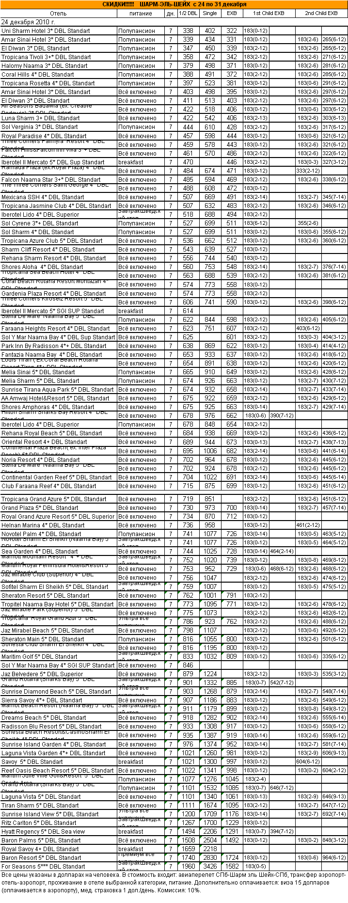 21 Дек 2010 14:02:42 ЕГИПЕТ. СПб-Шарм-СПб с 24.12 по 31.12 на 1 неделю. Красивый загар прямо к Новогоднему столу. Прилет в СПб в 18-35 - от фирмы АЛМА ТУР