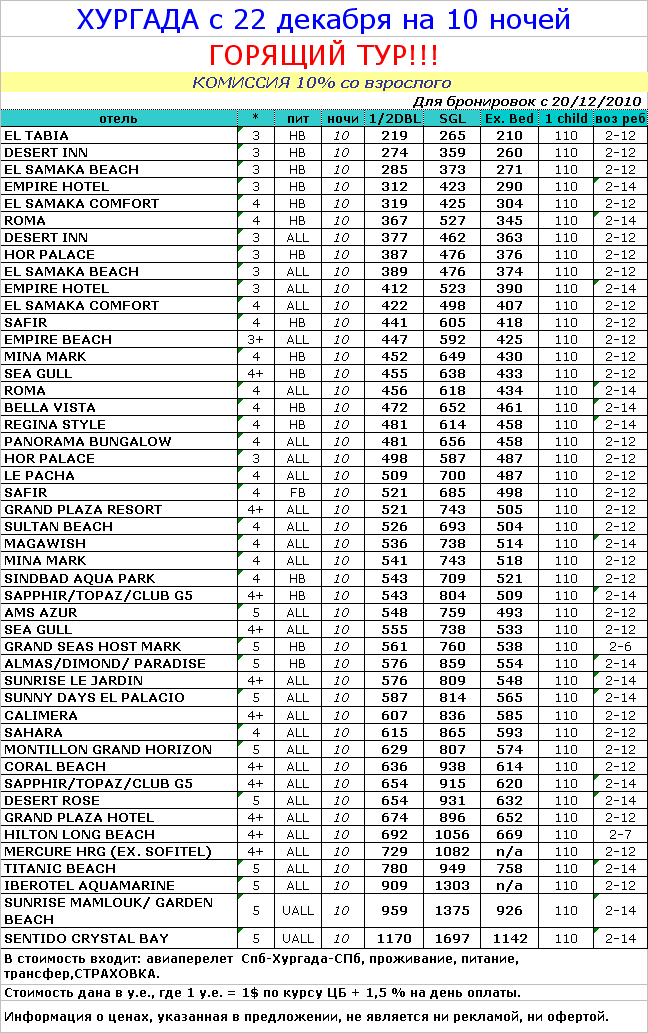 21 Дек 2010 11:57:04 ЕГИПЕТ-ХУРГАДА с 22 декабря на 10 ночей от фирмы БАГИРА