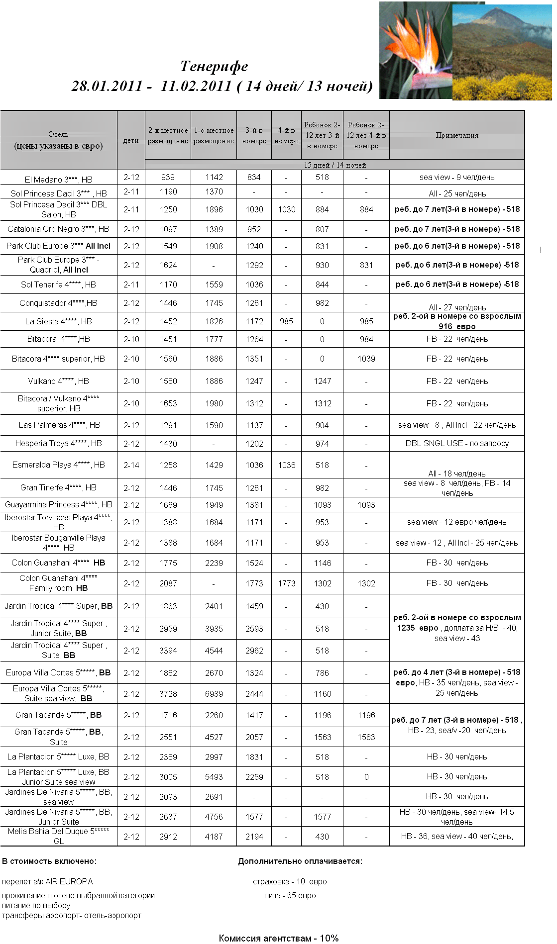23 Дек 2010 17:27:56 ИСПАНИЯ - ТЕНЕРИФЕ с 28.01 по 11.02 от фирмы ПРИМА