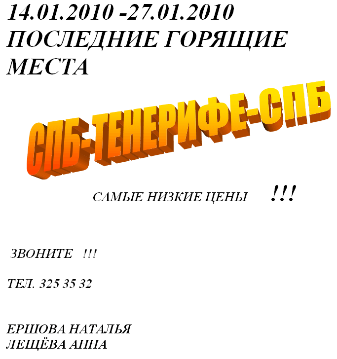 23 Дек 2010 18:01:26 ИСПАНИЯ - ТЕНЕРИФЕ - АВИАБИЛЕТЫ 14.01-27.01 - от фирмы ПРИМА