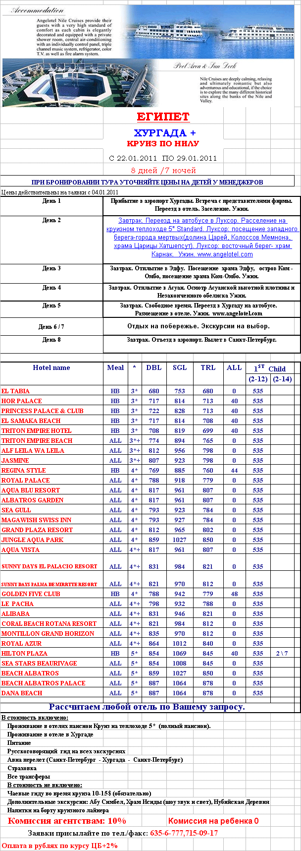 04 Янв 2011 11:22:54 ЕГИПЕТ. ХУРГАДА + КРУИЗ ПО НИЛУ С 22.01.2011 ПО 29.01.2011 от фирмы EL DAKAMY TRAVEL