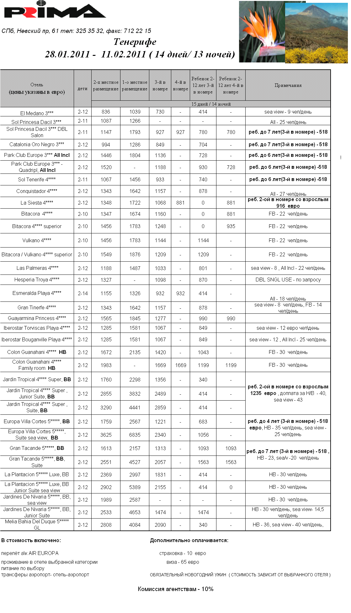 10 Янв 2011 13:47:06 ИСПАНИЯ - ТЕНЕРИФЕ 28.01-11.02 от фирмы ПРИМА
