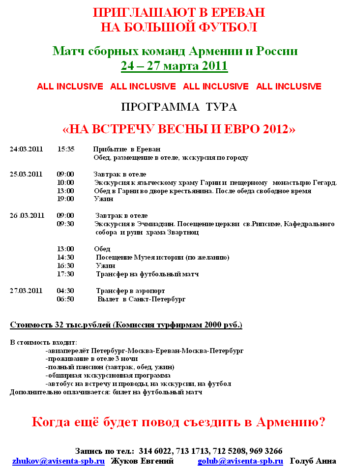 12 Янв 2011 11:00:58 АРМЕНИЯ-ЕРЕВАН. <НА ВСТРЕЧУ ВЕСНЫ И ЕВРО 2012> 24 - 27 марта 2011 от фирмы АВИСЕНТА