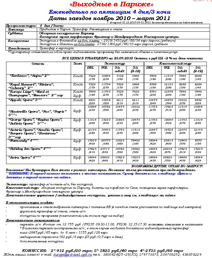 11 Янв 2011 15:18:35 ФРАНЦИЯ Выходные в Париже ноябрь 2010 - март 2011 от фирмы АКАДЕМИЯ