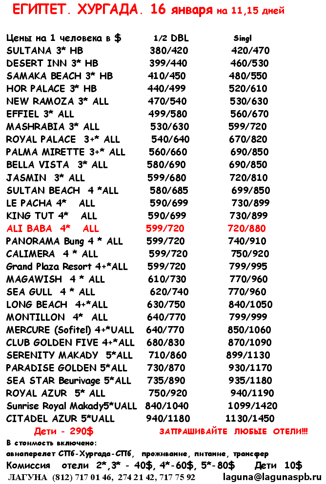 13 Янв 2011 12:45:50 ЕГИПЕТ, ХУРГАДА СКИДКИ 16 января на 11,15 дней от фирмы ЛАГУНА