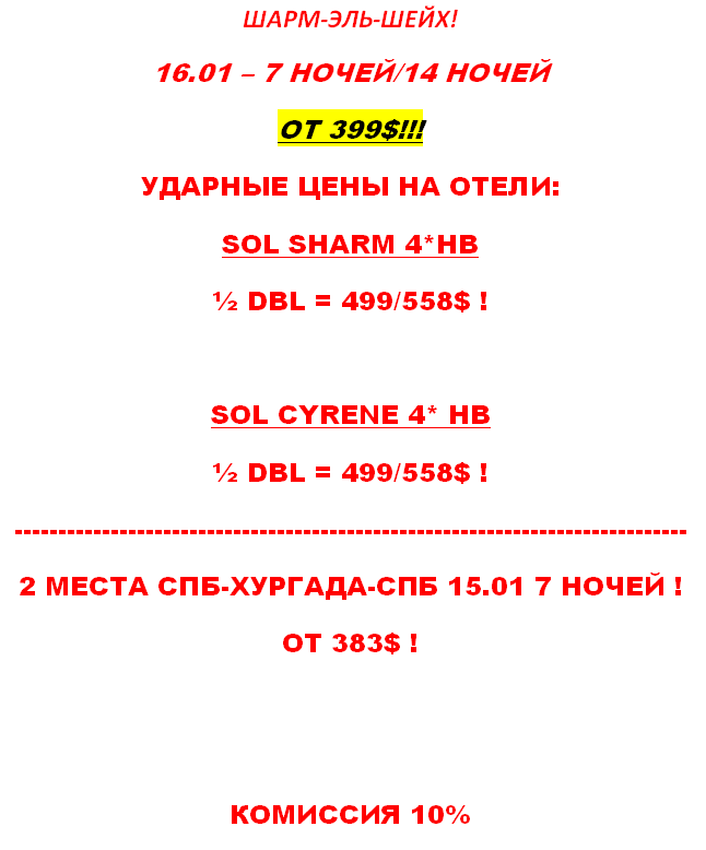 14 Янв 2011 13:30:14 ЕГИПЕТ - ПОСЛЕДНИЕ МЕСТА ХУРГАДА И ШАРМ-ЭЛЬ-ШЕЙХ 15/01 И 16/01 НА 1 И 2 НЕДЕЛИ от фирмы TRIVE ТУР