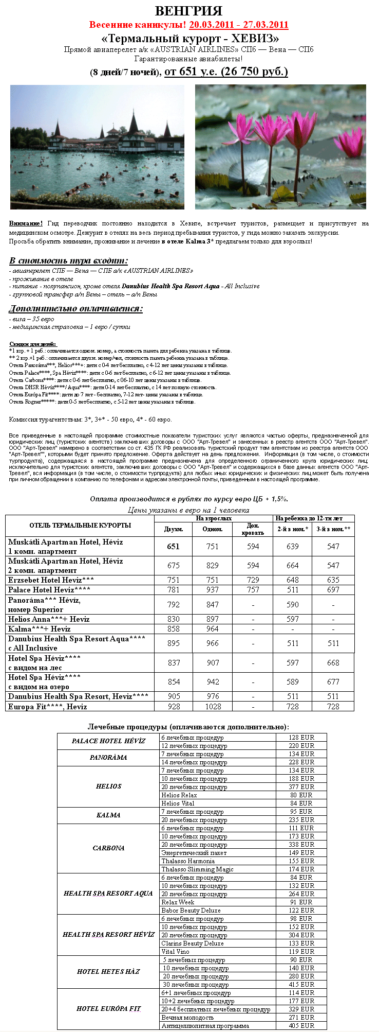 18 Янв 2011 10:09:39 ВЕНГРИЯ - Термальный курорт - ХЕВИЗ на весенние каникулы 20.03 - 27.03.2010 от фирмы АРТ-ТРЕВЕЛ