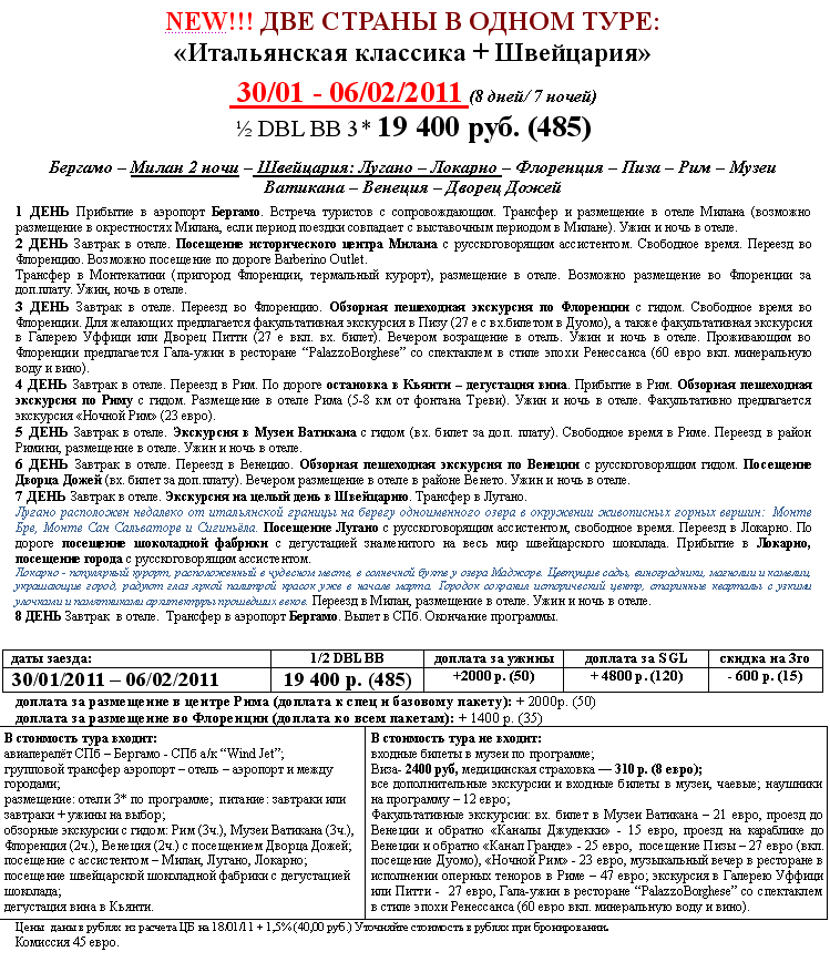19 Янв 2011 12:00:29 ИТАЛИЯ-ШВЕЙЦАРИЯ 30.01-06.02 от фирмы АРТ-ТРЕВЕЛ