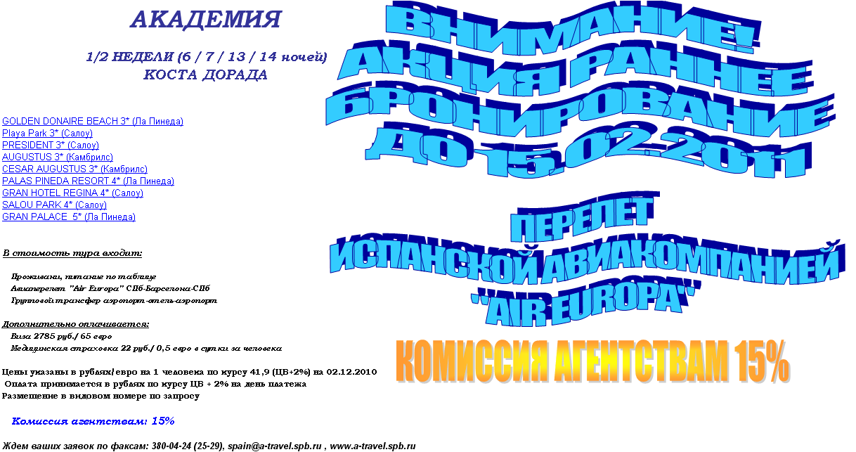 21 Янв 2011 13:24:39 ИСПАНИЯ - КОСТА ДОРАДА - 1/2 недели на 6/7/13/14 ночей - РАННЕЕ БРОНИРОВАНИЕ от фирмы АКАДЕМИЯ
