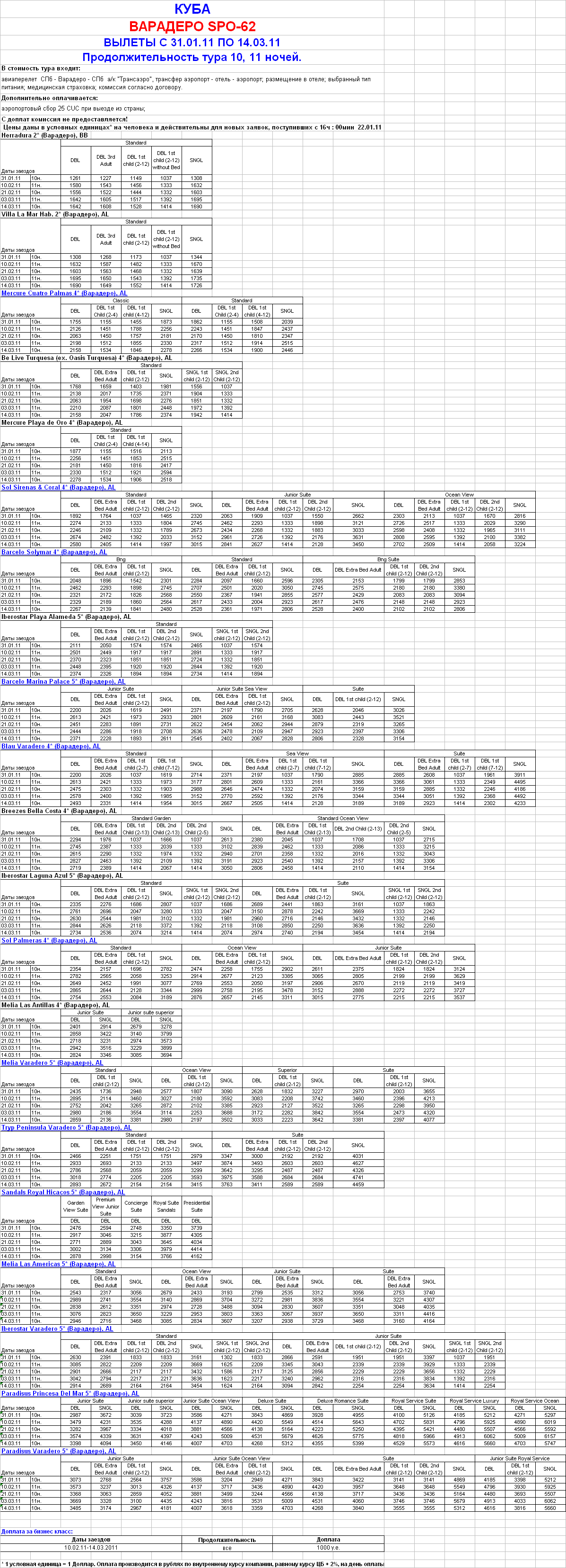 25 Янв 2011 11:43:37 КУБА. ВАРАДЕРО, вылеты 31.01.11-14.03.11 от фирмы - от фирмы ЮЖНЫЙ КРЕСТ