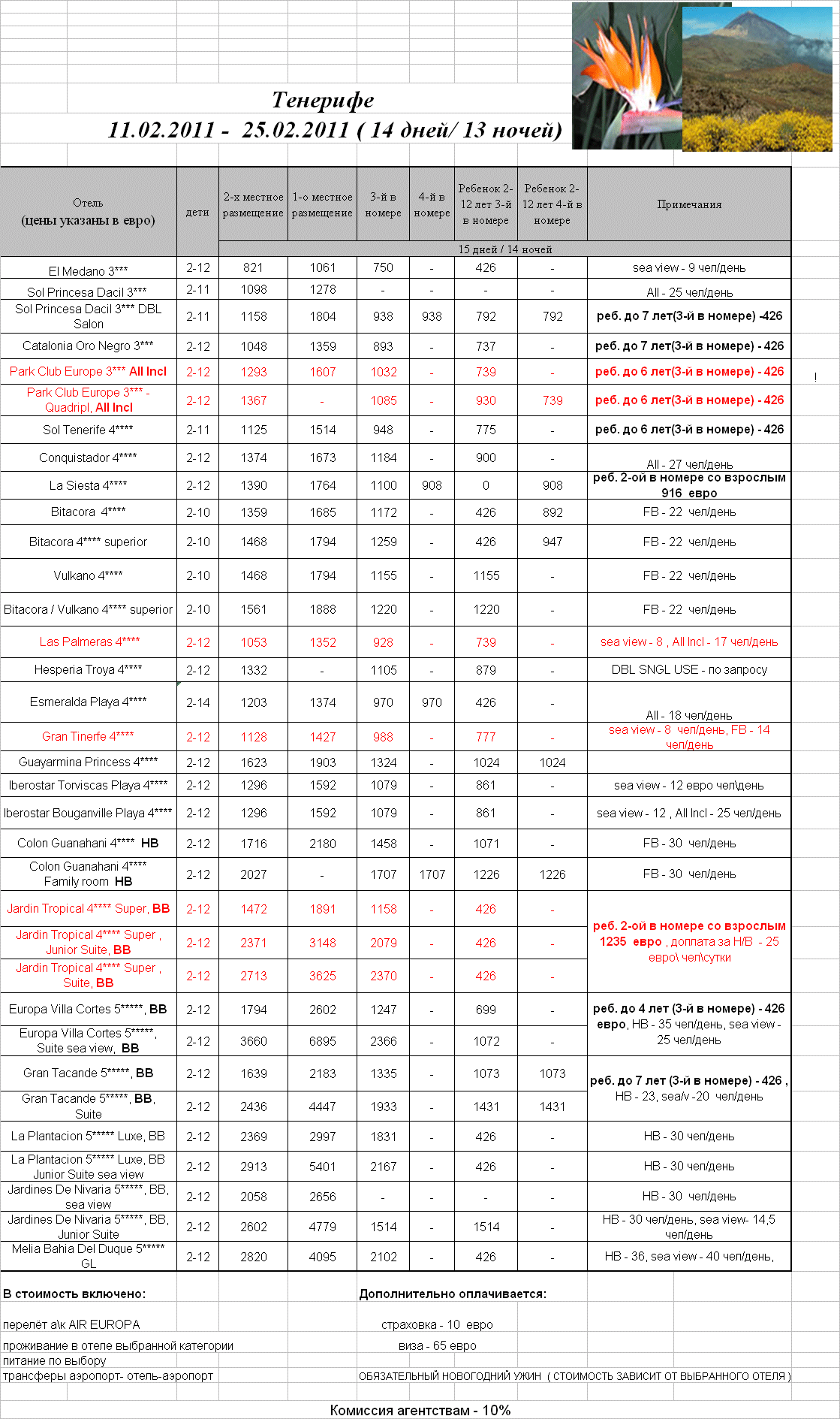 25 Янв 2011 18:00:13 ИСПАНИЯ. Тенерифе 11.02.2011 - 25.02.2011 (14 дней/ 13 ночей) от фирмы ПРИМА