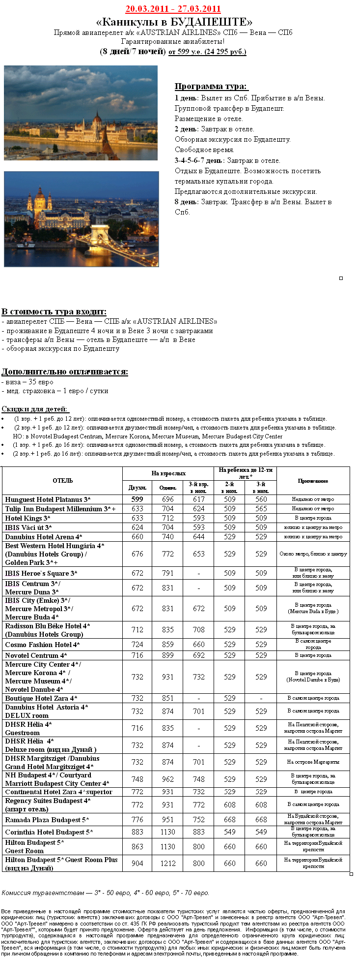 01 Фев 2011 10:04:47 ВЕНГРИЯ 20.03-27.03 БУДАПЕШТ на Весенние Каникулы от фирмы АРТ-ТРЕВЕЛ