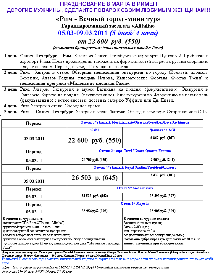 02 Фев 2011 10:20:03 ИТАЛИЯ 08 марта в Риме! от 550 евро от фирмы АРТ-ТРЕВЕЛ