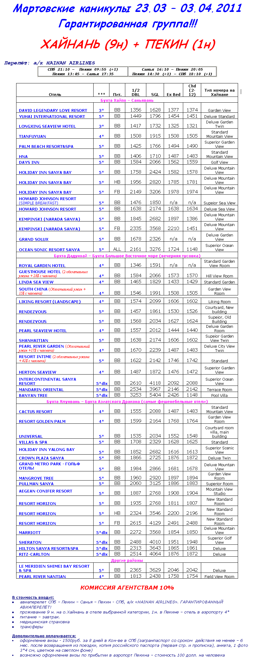 02 Фев 2011 12:45:16 КИТАЙ. КАНИКУЛЫ 23.03 - 03.04. ХАЙНАНЬ 9н + ПЕКИН 1н от 1346 USD ВКЛЮЧАЯ А/Б. ГАРАНТИРОВАННАЯ ГРУППА!!! от фирмы ПИТЕРТУР