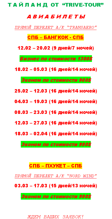 08 Фев 2011 14:34:03 ТАЙЛАНД АВИАБИЛЕТЫ от фирмы TRIVE ТУР