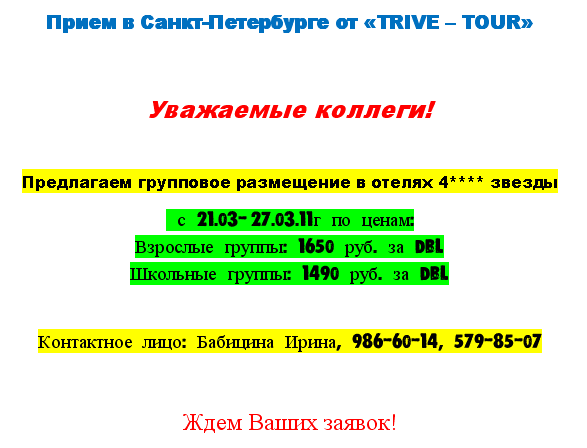 09 Фев 2011 11:06:32 РОССИЯ - Санкт-Петербург- Групповое размещение 21.03-27.03.11 от фирмы TRIVE ТУР