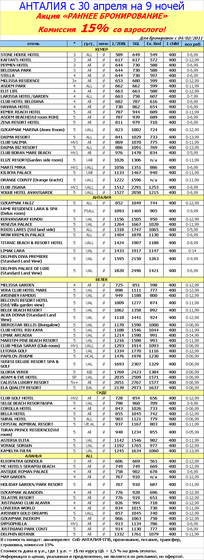 14 Фев 2011 13:12:07 ТУРЦИЯ. АНТАЛИЯ с 30 апреля на 9 ночей от фирмы БАГИРА