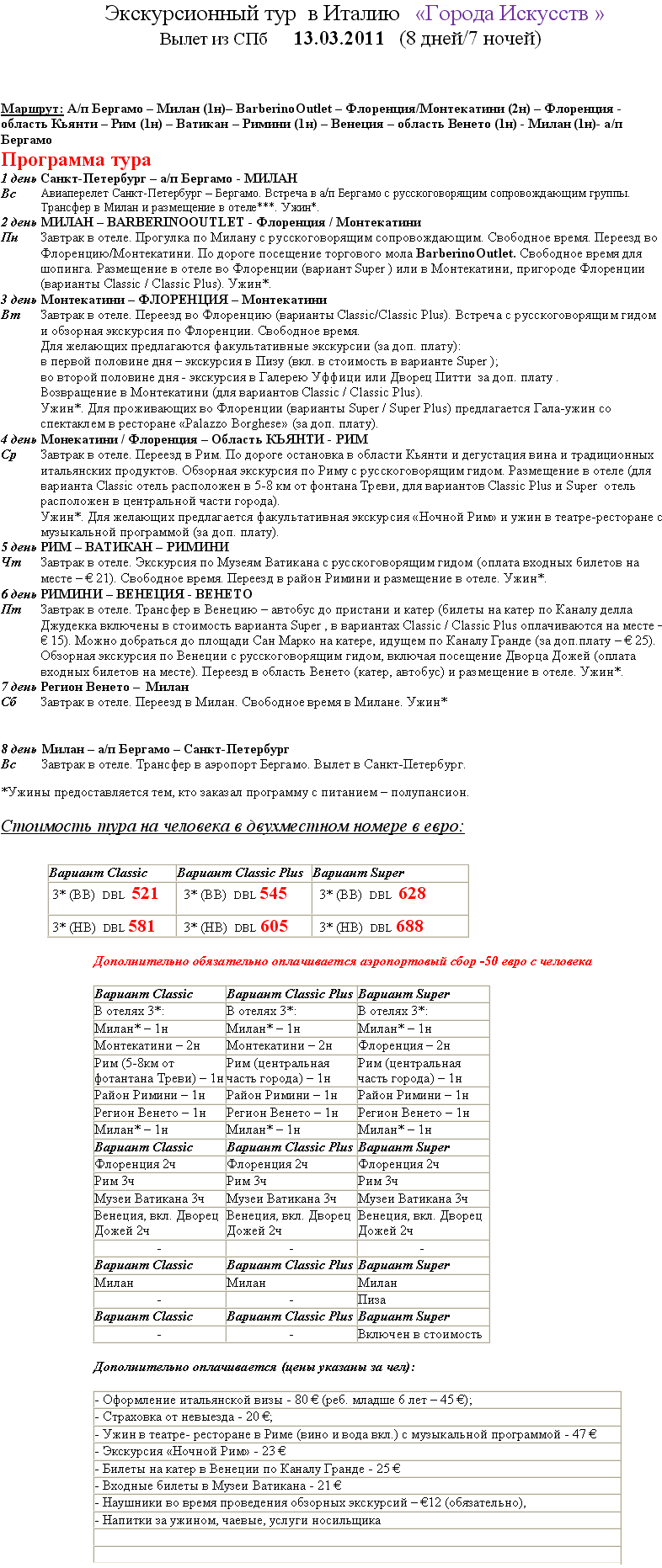 22 Фев 2011 10:27:52 ИТАЛИЯ 13.03-20.03 - "Города Искусств" - экскурсионный тур от фирмы ДЖЕТ ТРЕВЕЛ САНКТ-ПЕТЕРБУРГ