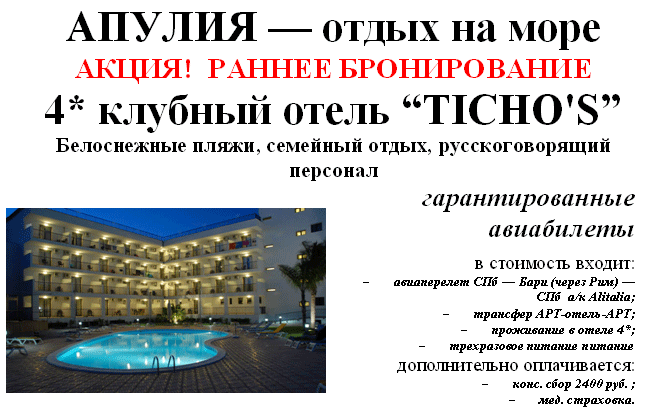 ИТАЛИЯ - Раннее бронирование Апулия от фирмы АРТ-ТРЕВЕЛ |