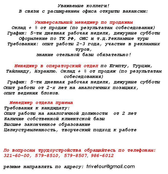24 Фев 2011 17:30:09 ВАКАНСИЯ от фирмы TRIVE ТУР