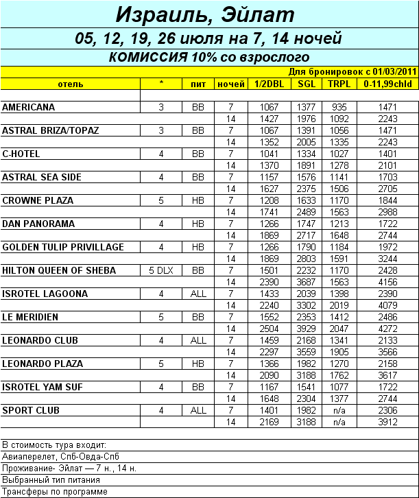 01 Мар 2011 17:10:14 ИЗРАИЛЬ - ЭЙЛАТ 05, 12, 19, 26 июля на 7/14 ночей от фирмы БАГИРА