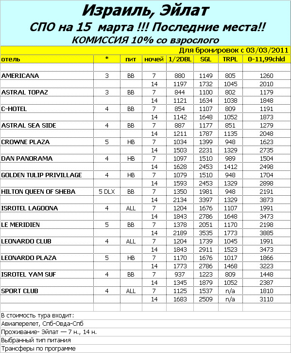 04 Мар 2011 15:35:08 ИЗРАИЛЬ. Эйлат-15 марта, последние места от фирмы БАГИРА