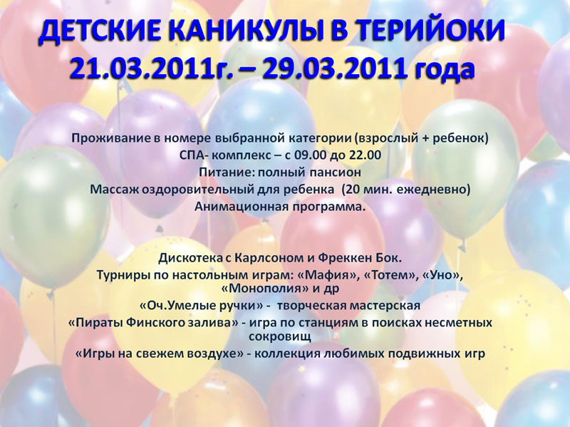 10 Мар 2011 12:04:53 РОССИЯ - Зеленогорск - КУРОРТ ТЕРИЙОКИ на ДЕТСКИЕ КАНИКУЛЫ от фирмы КУРОРТ ТЕРИЙОКИ