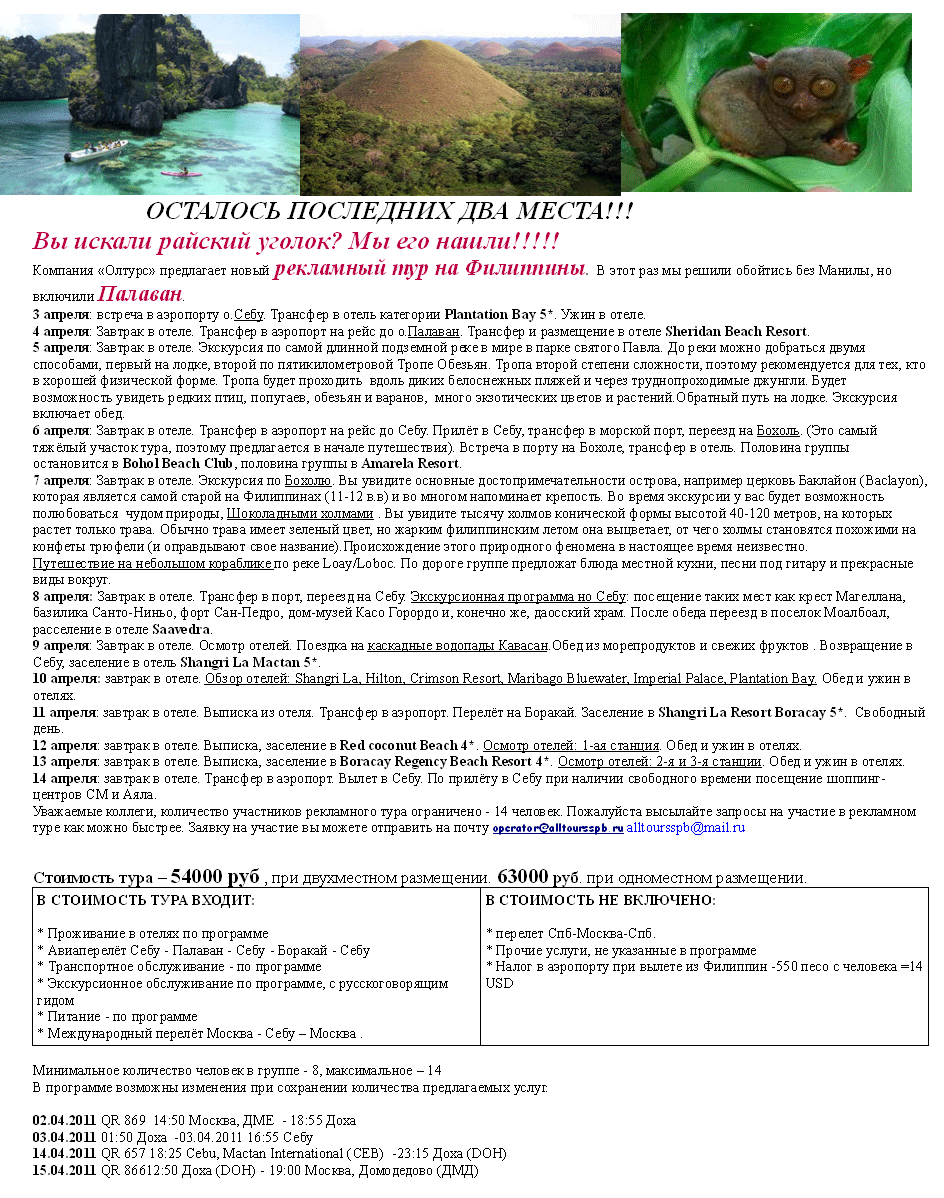 10 Мар 2011 12:05:26 РЕКЛАМНЫЙ ТУР НА ФИЛИППИНЫ!!! ОЧЕНЬ ОГРАНИЧЕННОЕ КОЛИЧЕСТВО МЕСТ!!! от фирмы ОЛЛТУРС