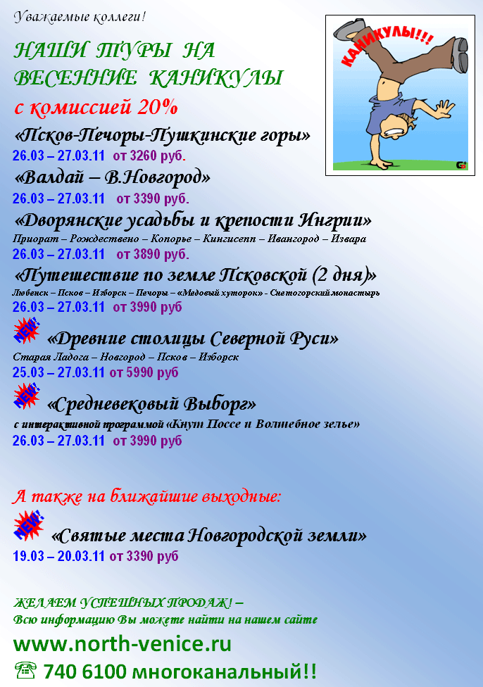 16 Мар 2011 11:15:48 РОССИЯ. ТУРЫ НА ШКОЛЬНЫЕ КАНИКУЛЫ с комиссией 20% от фирмы СЕВЕРНАЯ ВЕНЕЦИЯ