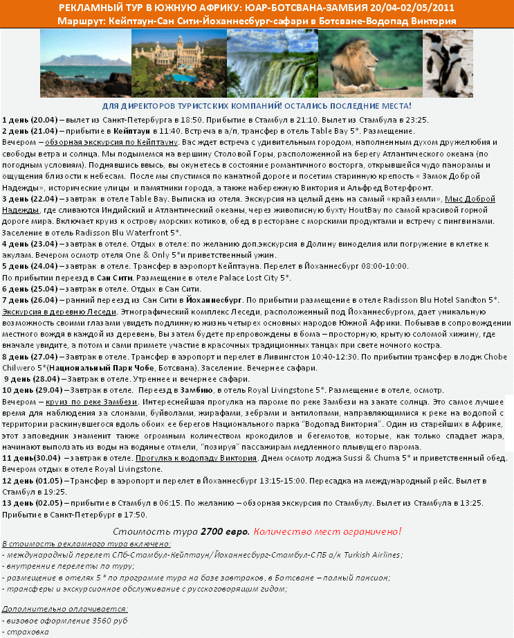 21 Мар 2011 17:02:54 РЕКЛАМНЫЙ ТУР ЮАР-БОТСВАНА-ЗАМБИЯ 22.04-2.05 ИЗ СПБ! ПОСЛЕДНИЕ МЕСТА!! от фирмы КОНКОРД ТРЕВЕЛ