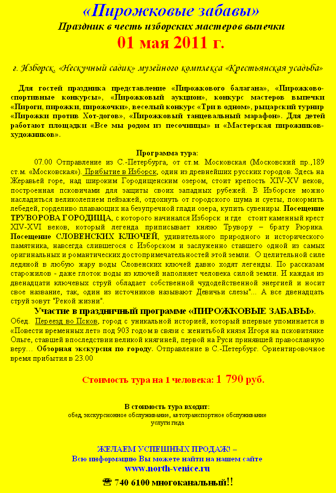 23 Мар 2011 11:12:28 РОССИЯ - г. Изборск <Пирожковые забавы> 01 мая 2011 г. от фирмы СЕВЕРНАЯ ВЕНЕЦИЯ