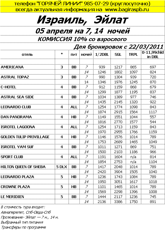 22 Мар 2011 13:09:32 ИЗРАИЛЬ - ЭЙЛАТ 05.04 на 7/14 ночей от фирмы БАГИРА