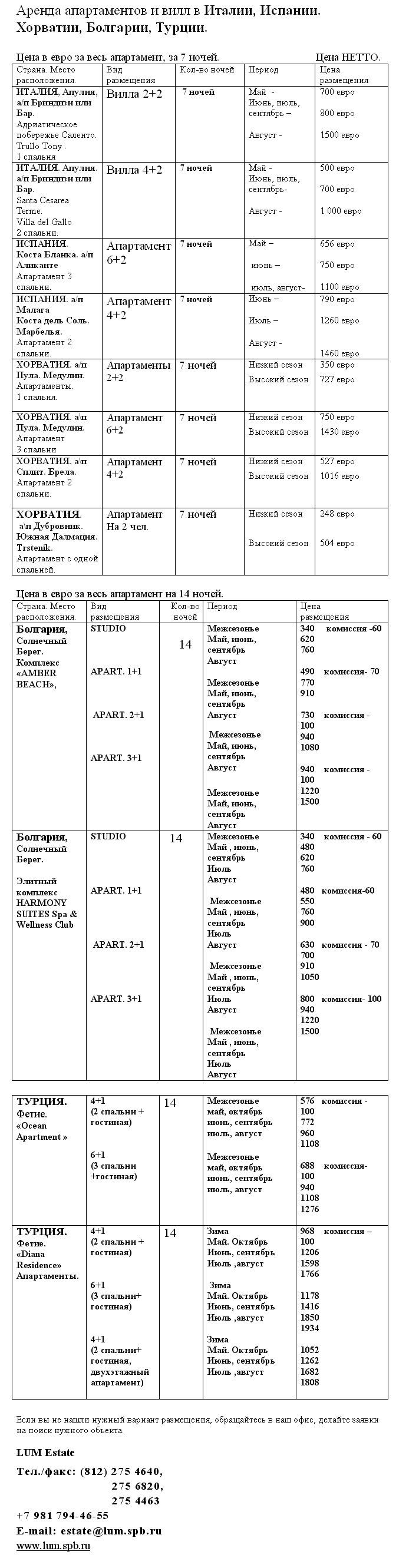 30 Мар 2011 14:55:10 ИТАЛИЯ, ИСПАНИЯ, ХОРВАТИЯ, БОЛГАРИЯ, ТУРЦИЯ. Аренда апартаментов и вилл от фирмы ЛУЧШЕ УЗНАЙ МИР