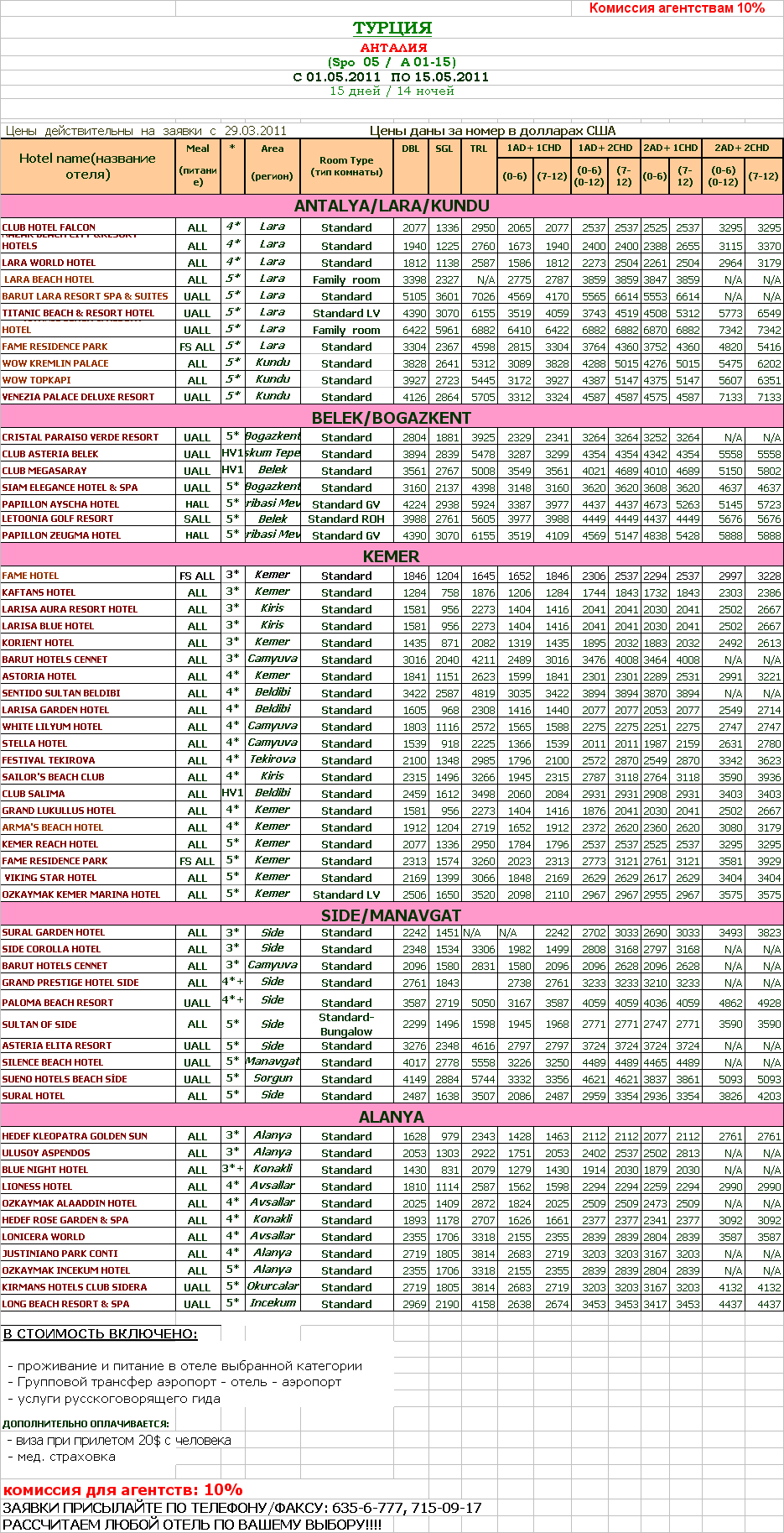 30 Мар 2011 15:19:54 ТУРЦИЯ. АНТАЛИЯ С 01.05.2011 ПО 15.05.2011 от фирмы EL DAKAMY TRAVEL
