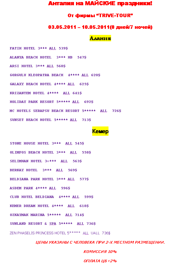 05 Апр 2011 15:04:40 ТУРАЦИЯ - АНТАЛИЯ НА МАЙСКИЕ ПРАЗДНИКИ! от фирмы TRIVE ТУР